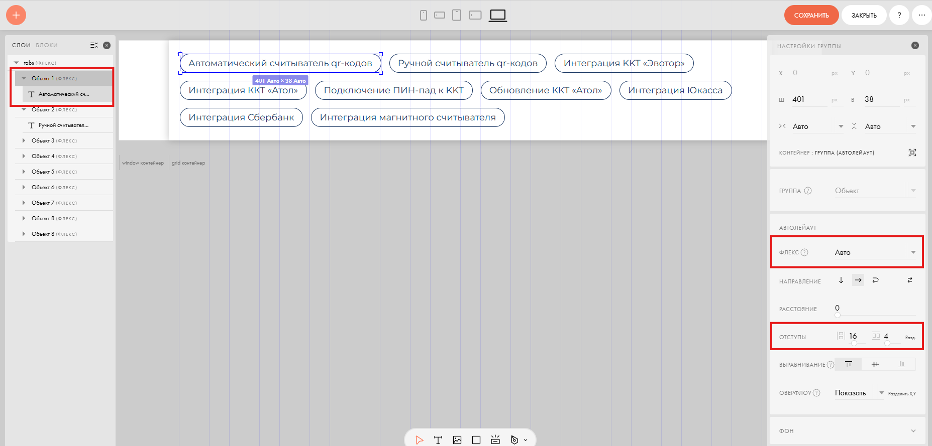 - В правой панели настроек включите Autolayout. Настройте цвет группы, отступы, обводку и скругление (например, 30px).