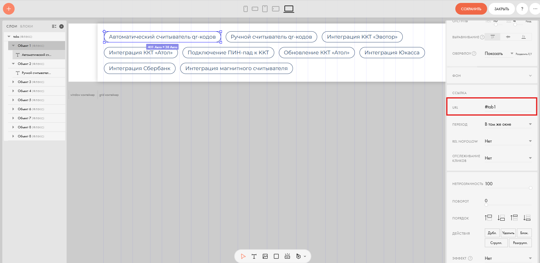 - В поле URL (ссылка) пропишите якоря: #tab1 для первой кнопки, #tab2 для второй и так далее.